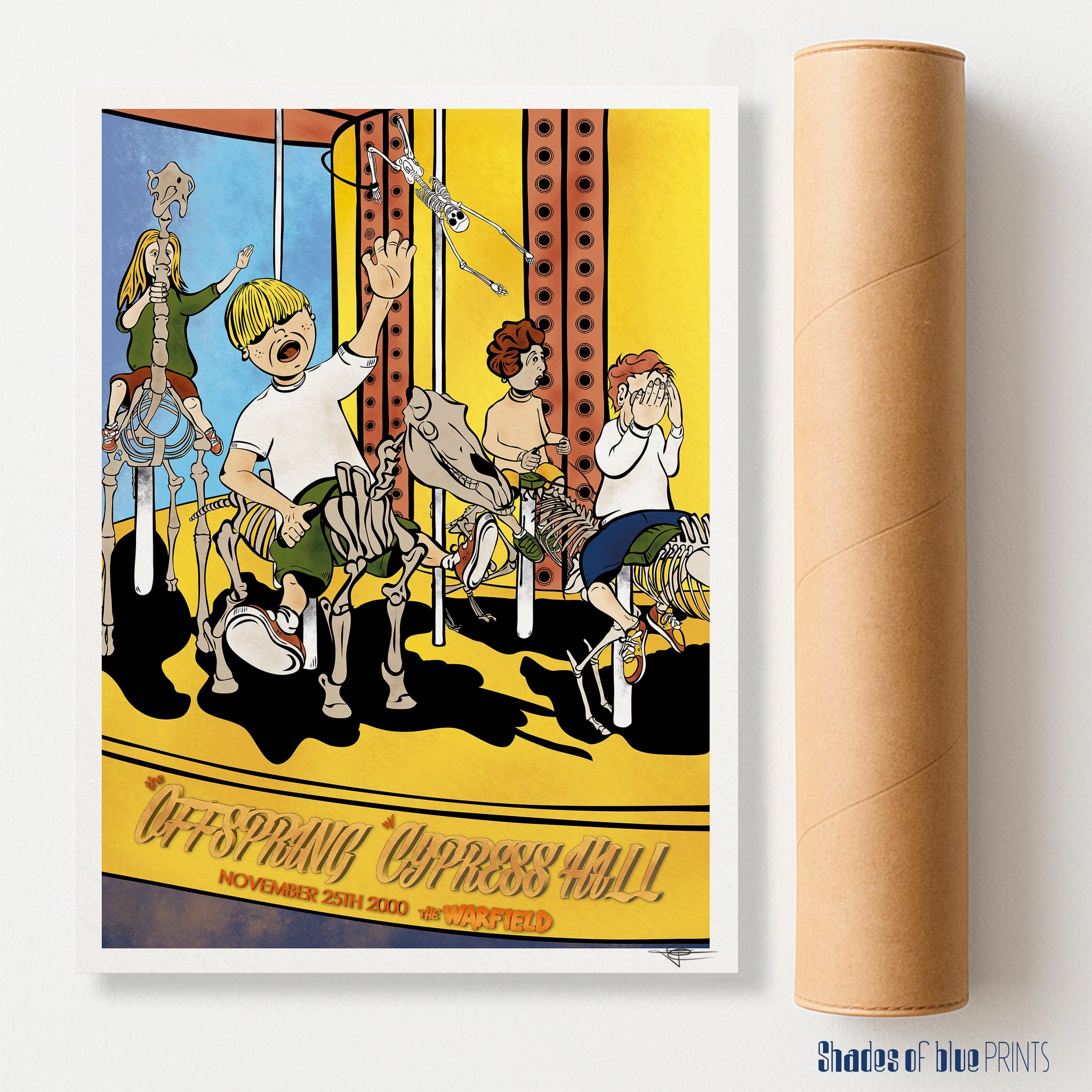 Lately I decided to make a print off that venue and while brainstorming it struck me that something that both bands shared is skeletons, so I decided to go with a merry go round in which animals would be only skeletons, and the monkey you try to grab to get a free run a…well, a monkey skeleton…Of course as much as some of the kids would love it, some would be terrified by the view….