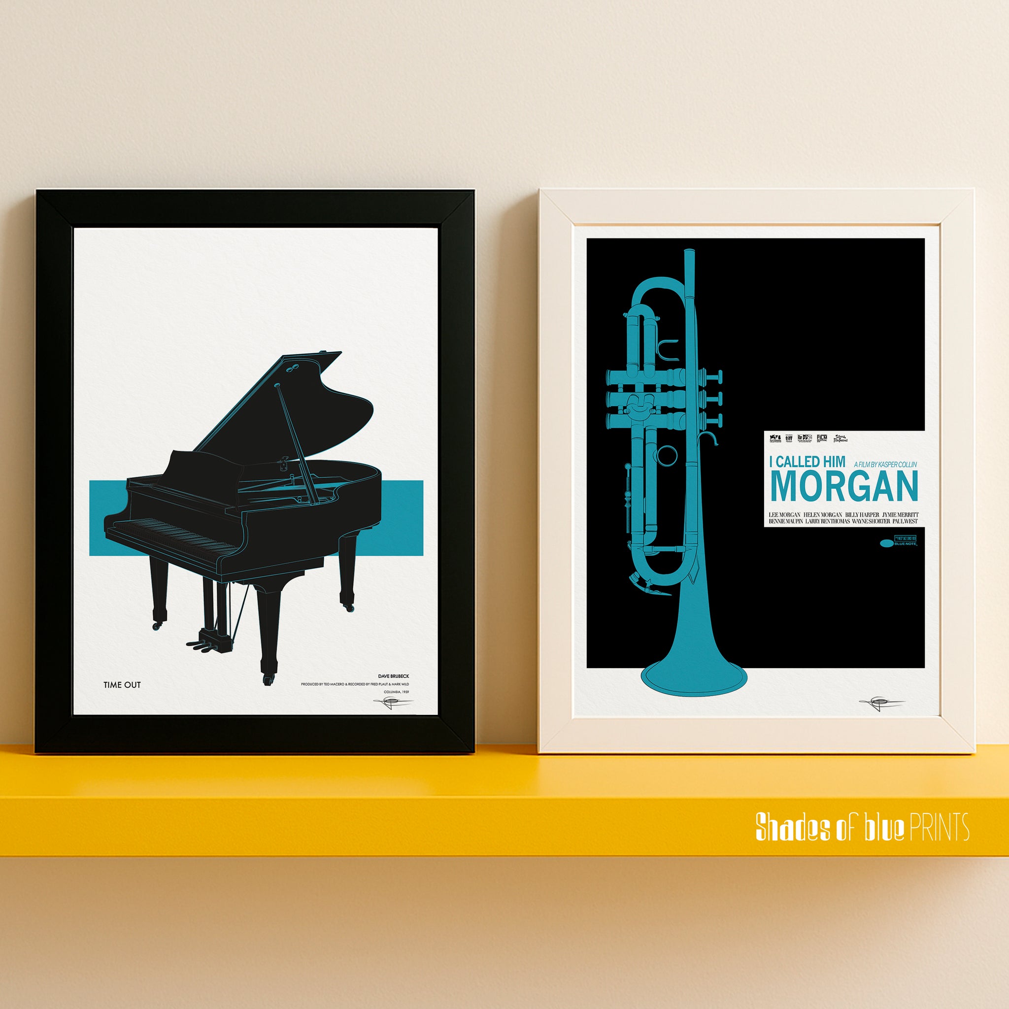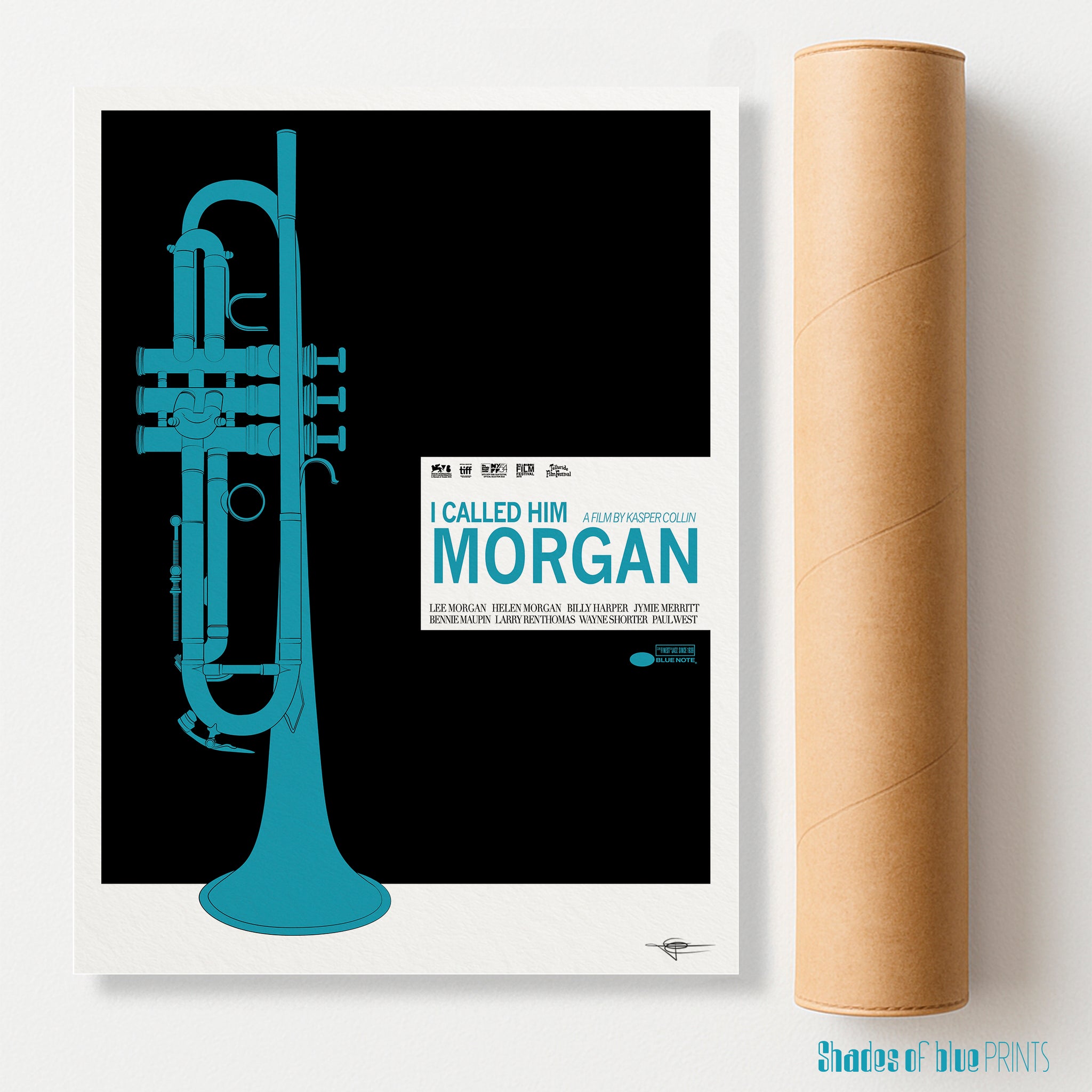 On the print I wanted 2 things, like I always do for my jazz instrument prints I wanted that the instrument be the one (in this case one of them, as the musician had to let go of some of his best instruments to support his unlucky habit) he was most recognized for, in this case a French Besson Brevete trumpet, and as for the colors I wanted something recognizable of the Blue Note label as most of Lee Morgan's LPs were recorded on the infamous jazz label, so I went with the blue & black.