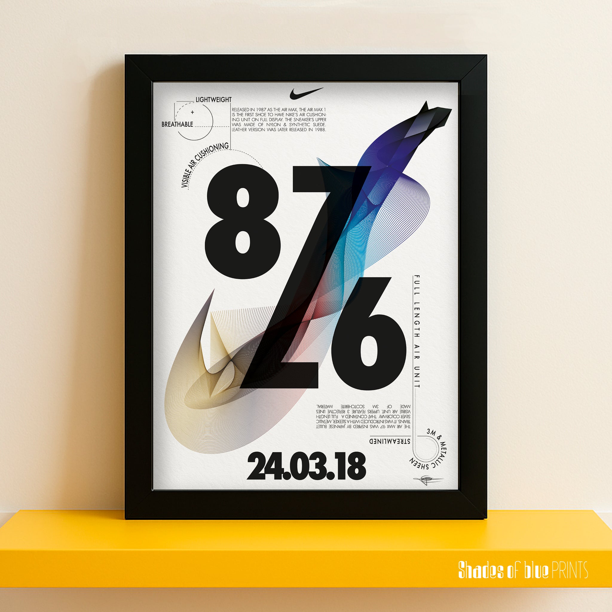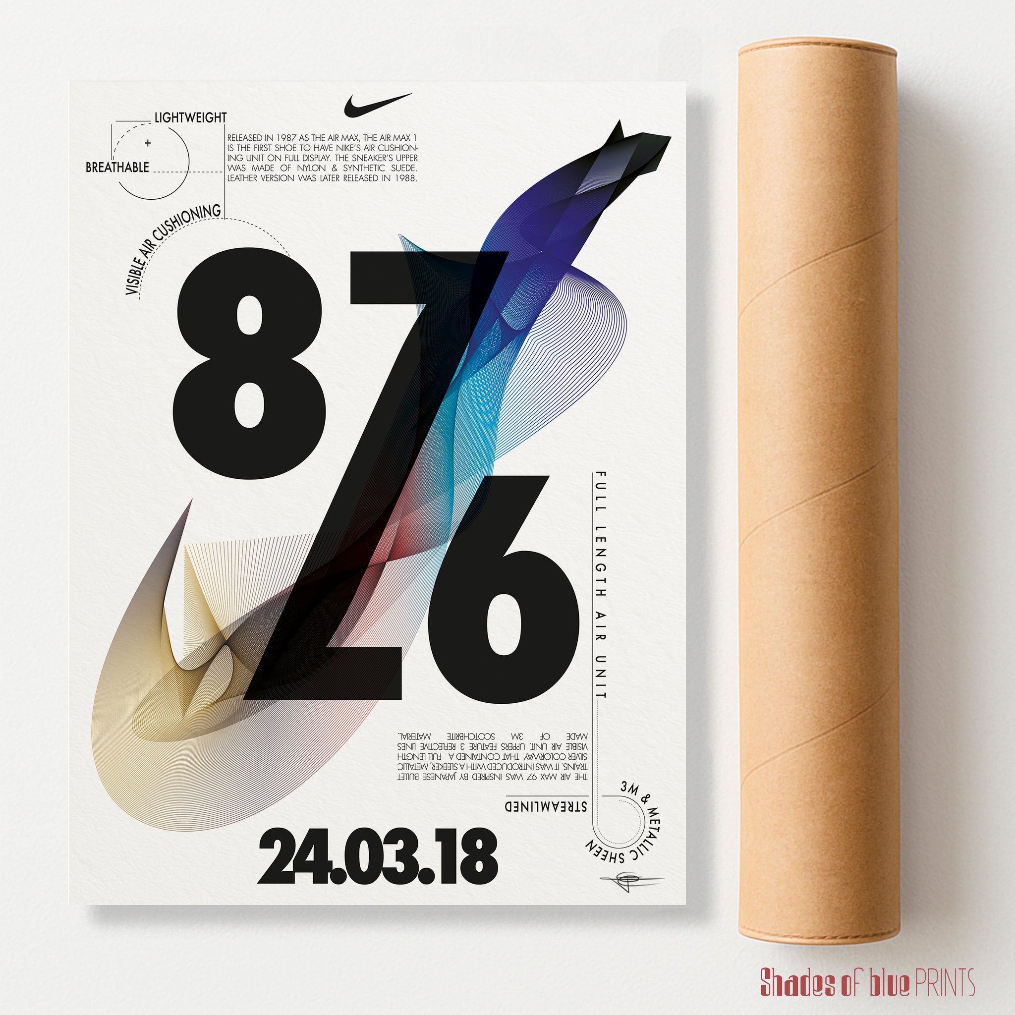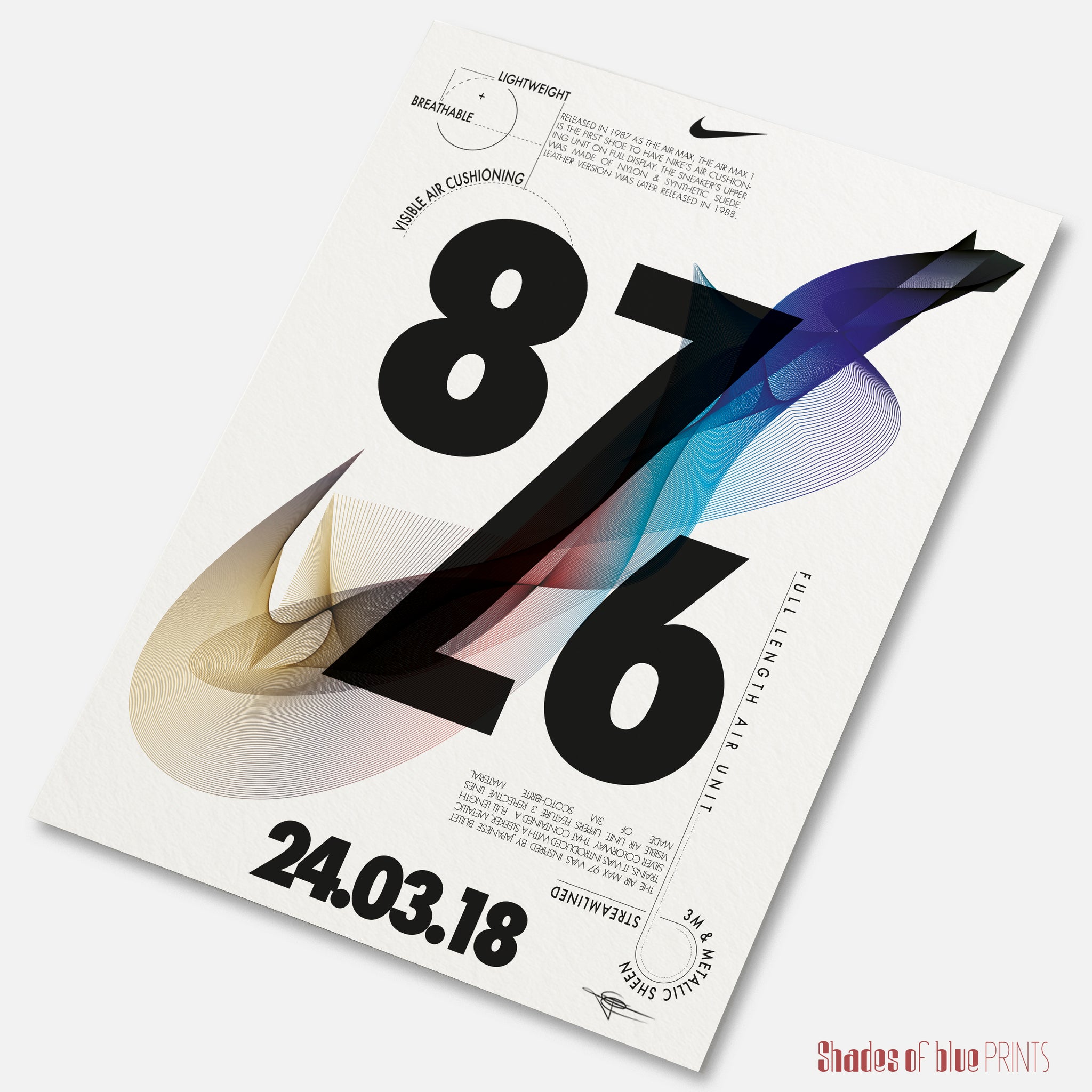 The original poster had the store's address and other infos that I took off to make this a more universal print. The 87 (date of the release of the original air max 1) blends with the 97 date with a blended organic swoosh made of the colors of the Wotherspoon air max.